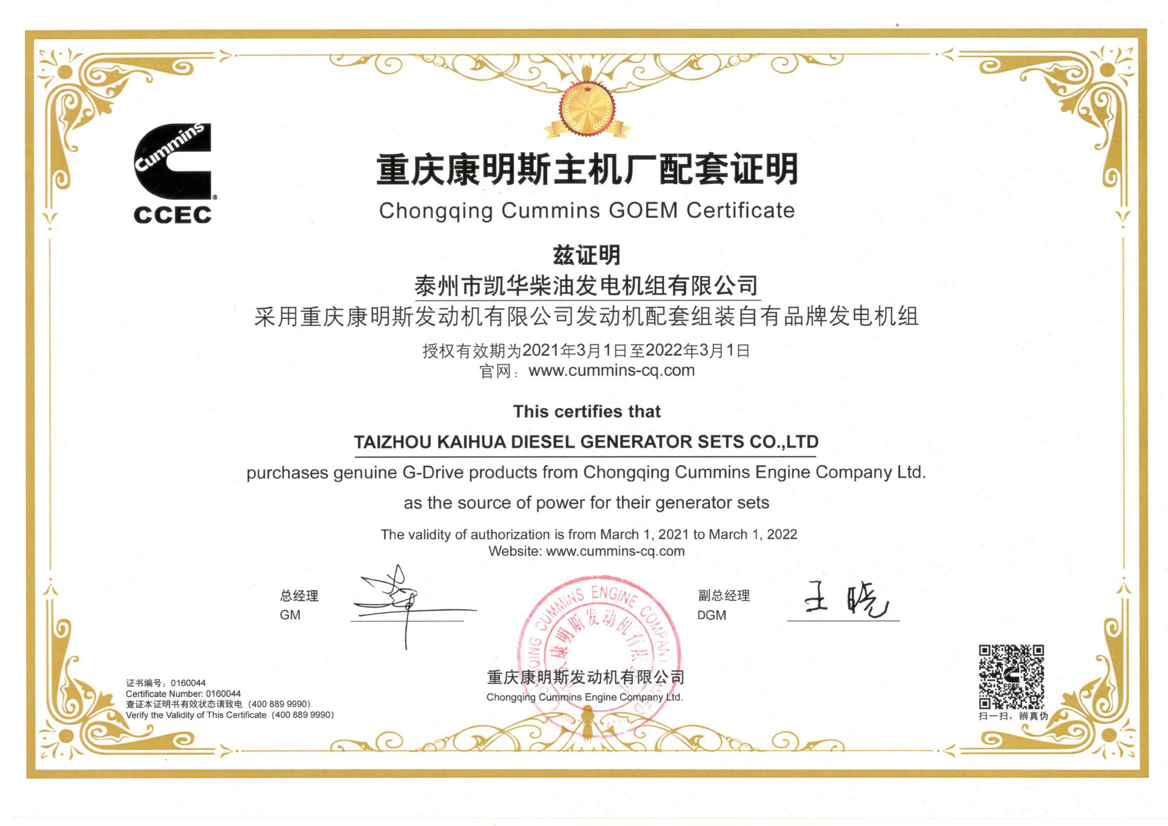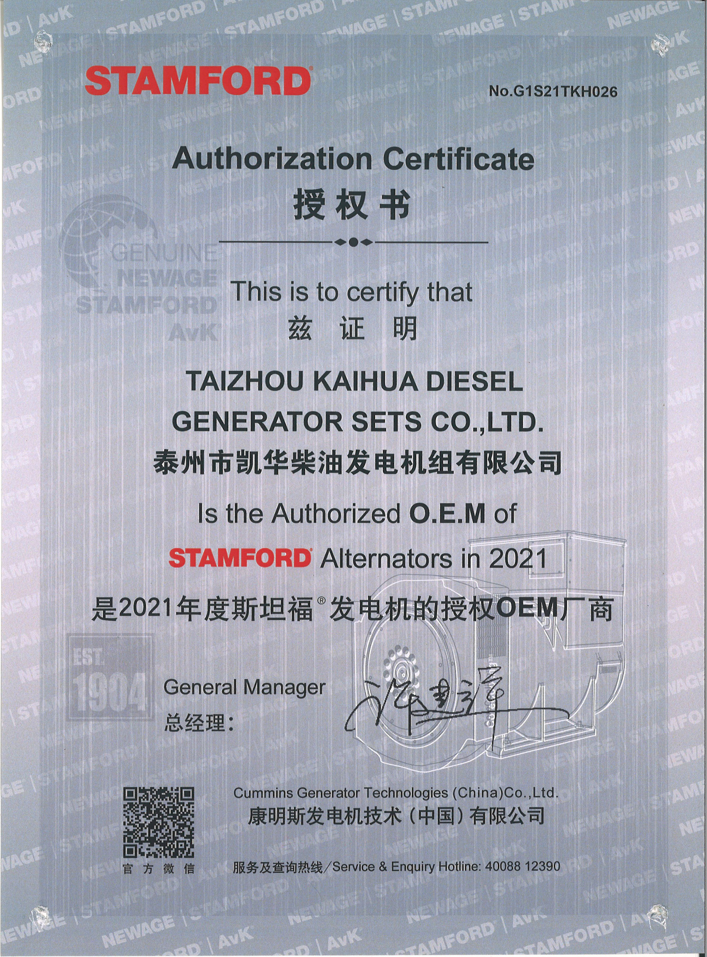 泰州市凱華柴油發(fā)電機(jī)組有限公司創(chuàng)建于2003年,是一家集柴油發(fā)電機(jī)組燃?xì)獍l(fā)電機(jī)組的研發(fā)、生產(chǎn)、銷售為一體的高新技術(shù)民營企業(yè),公司座落于“漢唐古郡,淮海名區(qū)”,具有“鳳凰城”美稱的祥泰之州——江蘇省泰州市,地處中國經(jīng)濟(jì)最發(fā)達(dá)的長三角經(jīng)濟(jì)圈,水陸空立體交通,地理位置十分優(yōu)越。公司目前注冊(cè)資本金11800萬元人民幣,生產(chǎn)基地占地六十畝,現(xiàn)有各類高素質(zhì)員工一百多名,專業(yè)技術(shù)人員達(dá)46人,其中高級(jí)技術(shù)人員16人,年銷售額近6億元。 公司主營產(chǎn)品:3~3000KW陸用柴油發(fā)電機(jī)組,15~600KW移動(dòng)拖車電站,12~1000KW船用應(yīng)急柴油發(fā)電機(jī)組,各種靜音型、中高壓、多機(jī)并聯(lián)、燃?xì)獾忍胤N機(jī)組以及進(jìn)口系列柴油發(fā)電機(jī)組,可滿足不同客戶的一切電力需求,還可滿足用戶不同電壓、不同頻率的要求。凱華公司是康明斯品牌的授權(quán)代理商,專業(yè)生產(chǎn)供應(yīng)康明斯柴油發(fā)電機(jī)組。